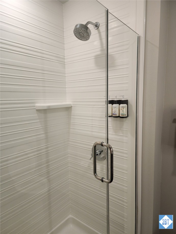 Toiletries for both the sink and the shower were wall-mounted and were by Dove.