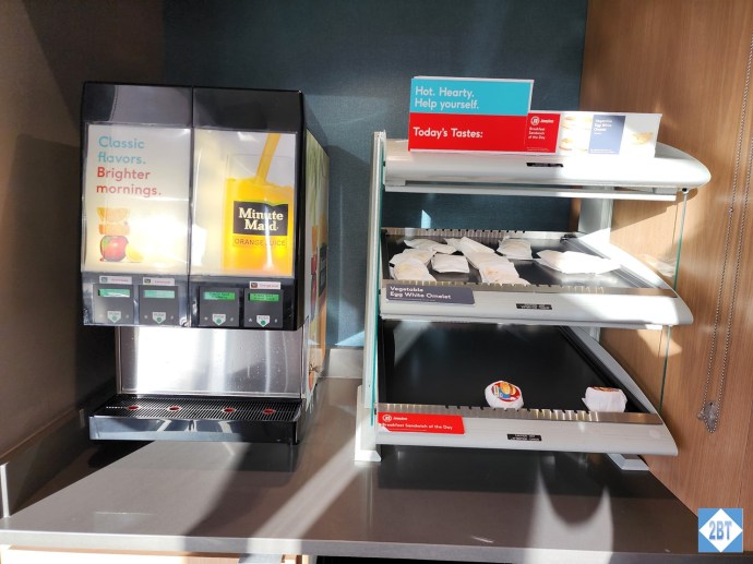 Along the back wall were several stations. The leftmost station had two types of juice along with the hot entrees of the day. For the day we were there that was an egg white omelet along with a breakfast sandwich, though there were no sandwiches by the time we arrived.