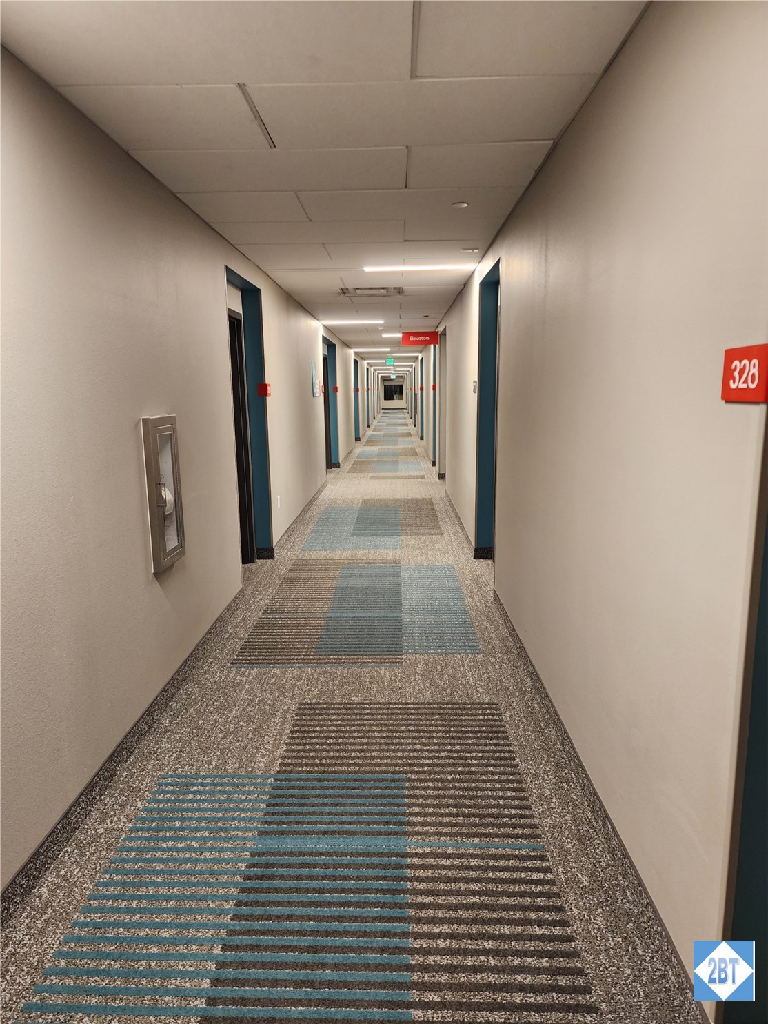 Our room was on the third floor. Leaving the elevator lobby we turned left down this long hall (the red sign denotes the elevator lobby).