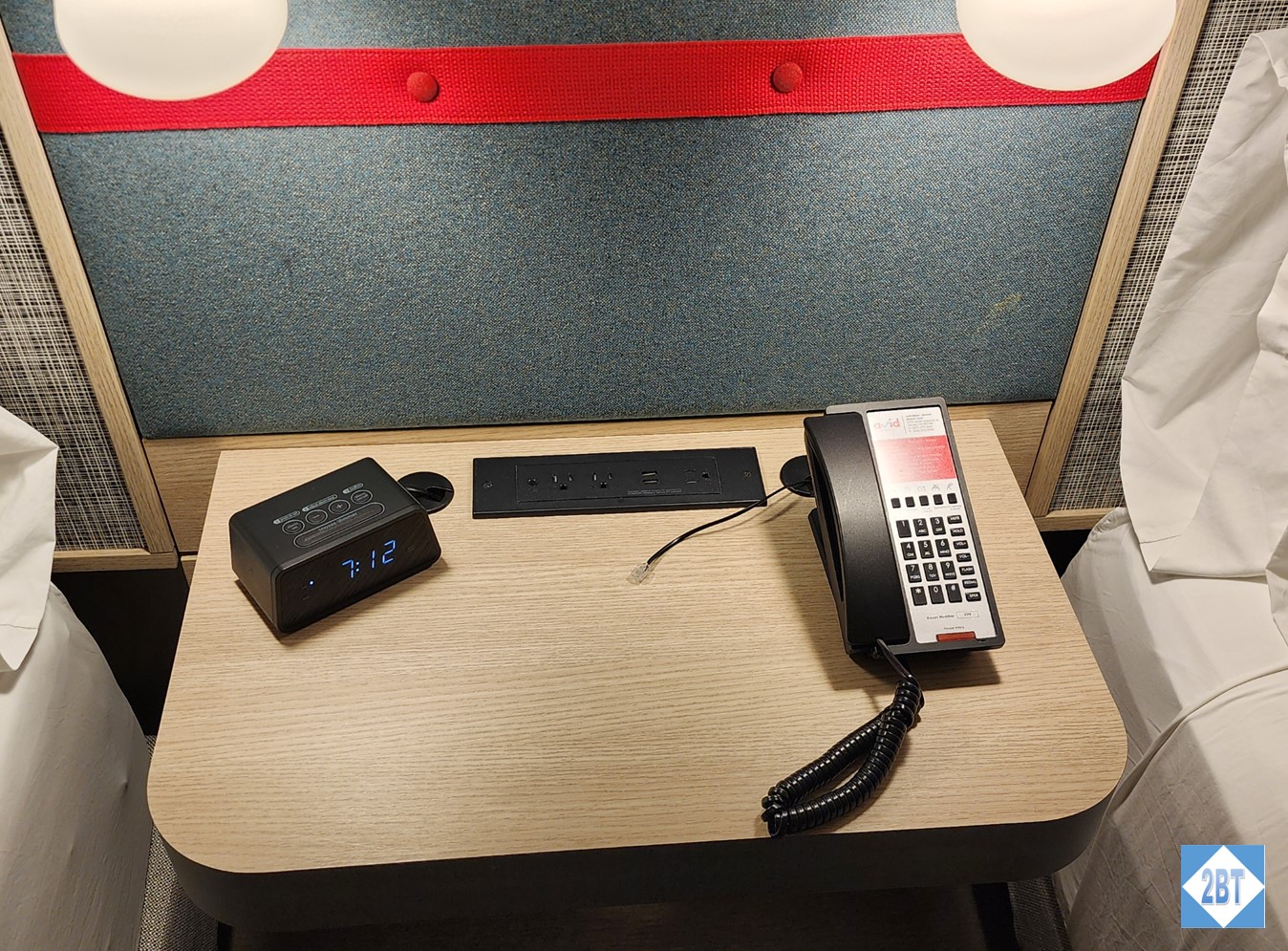 There was a single night stand between them with a very bright alarm clock, a phone and several charging outlets.