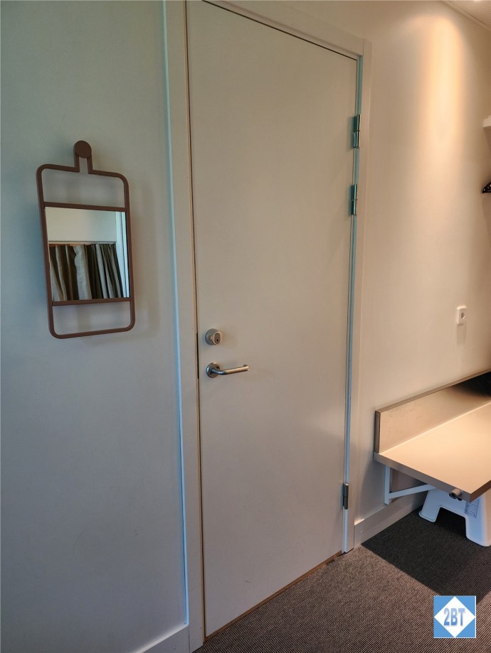 By the door there’s a hanging rack and a bench where two suitcases could rest. There are also pegs on the wall that can be used for jackets, etc.