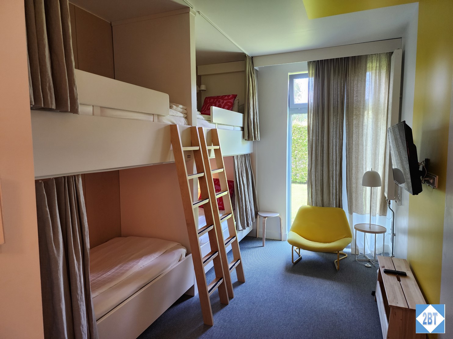 We booked a family room which had two sets of bunk beds built into one wall. There’s only one chair by the window but there is a bench under the TV.