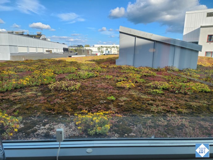 Looking out from the living room the roof of the lobby area is visible and it’s been covered with vegetation making it both prettier and functional.